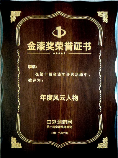 2019年6月,必一(中国)_必一平台漆李斌同志在中外涂料网第十届金漆奖评选活动中被评为“年度风云人物”