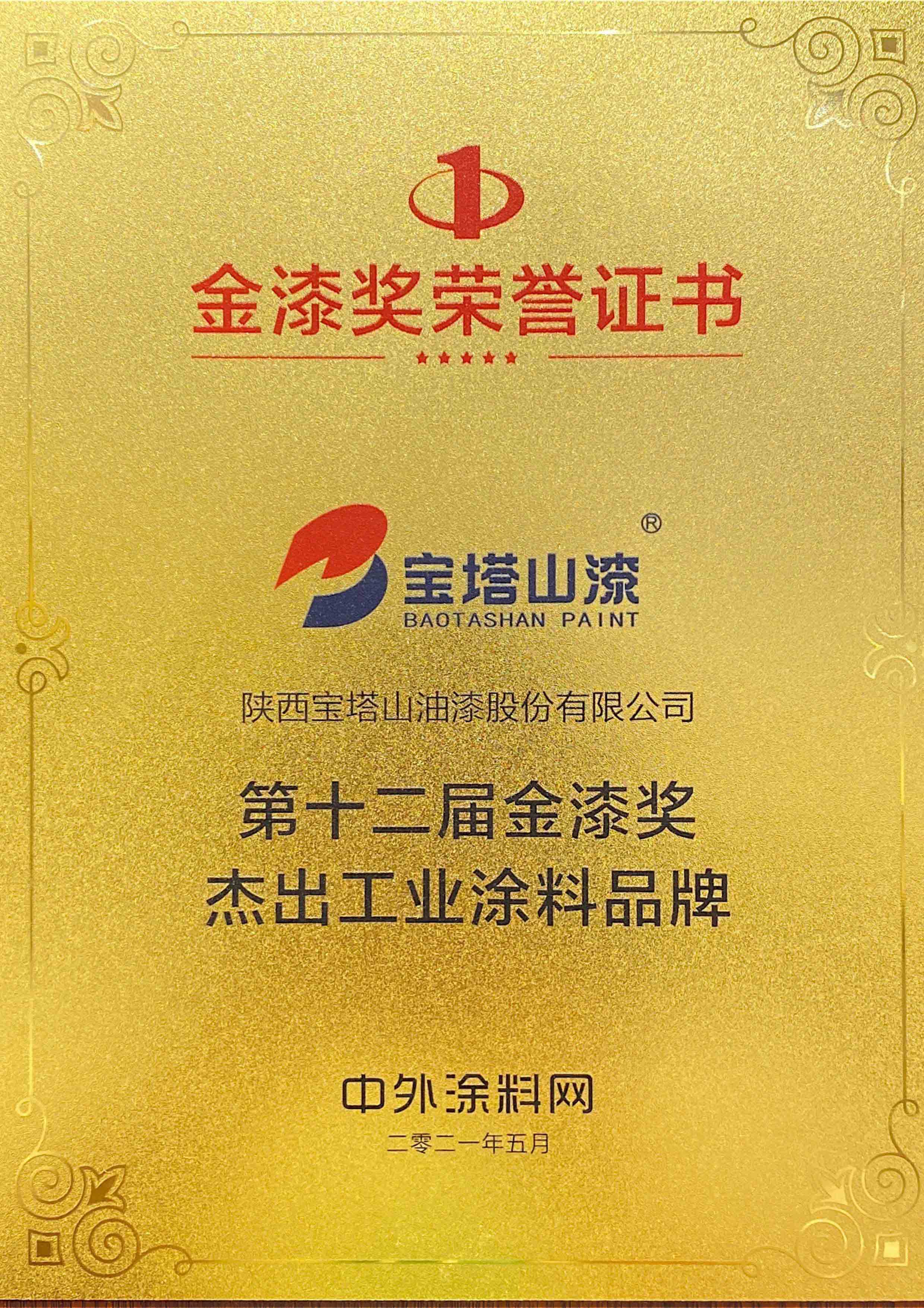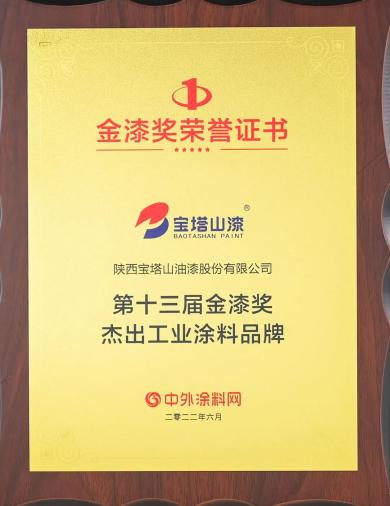 2022年6月,必一(中国)_必一平台漆荣获第十三届金漆奖“杰出工业涂料品牌”。