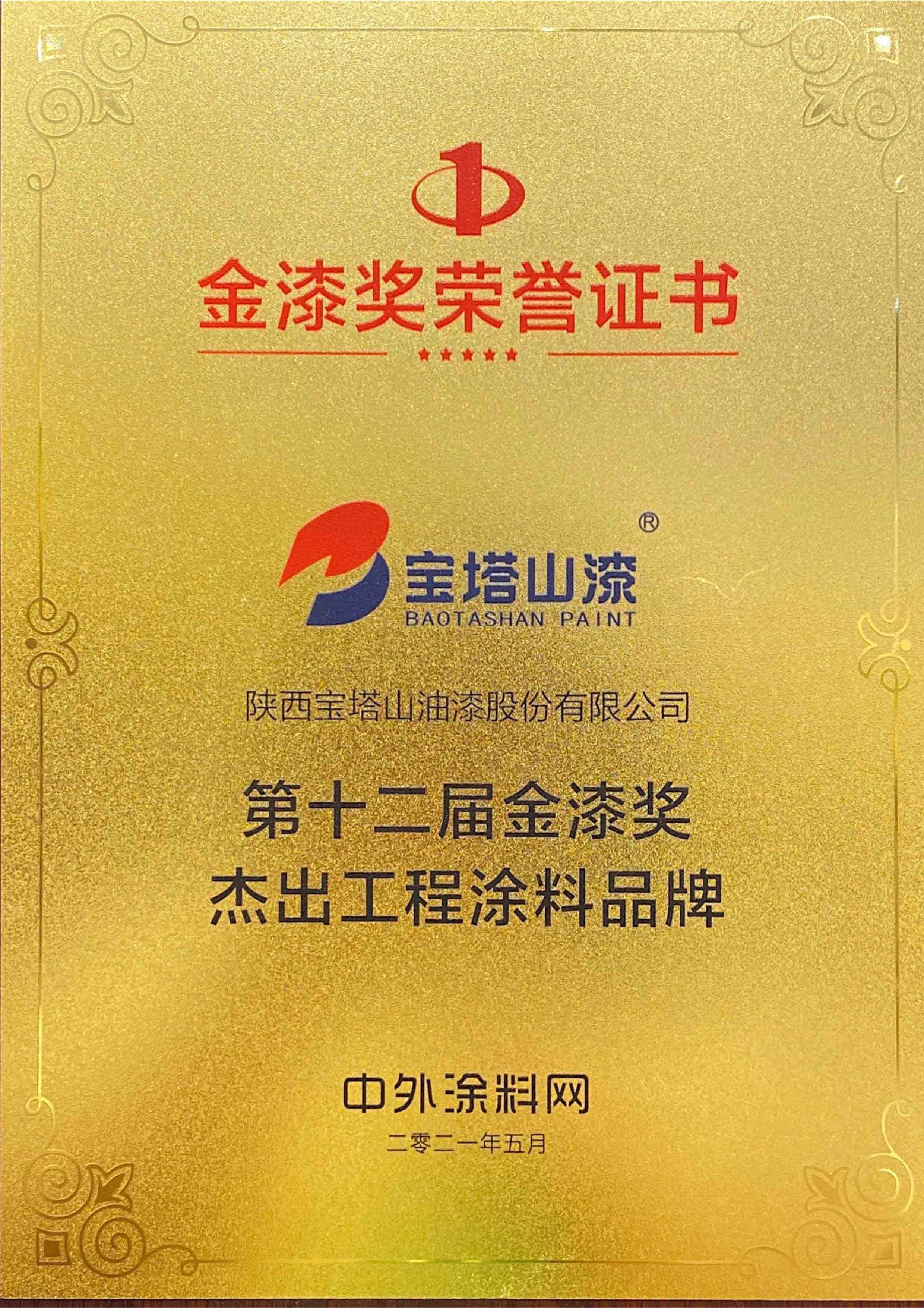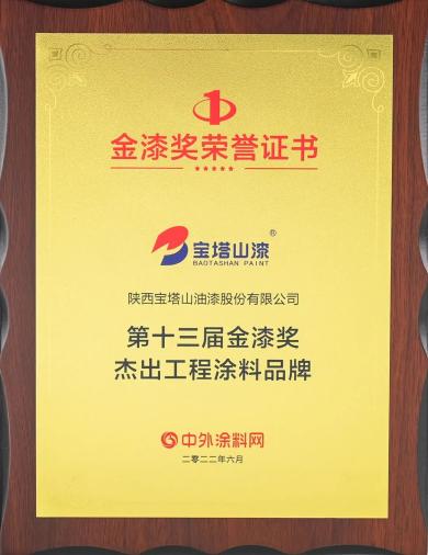 2022年6月,必一(中国)_必一平台漆荣获第十三届金漆奖“杰出工程涂料品牌”。