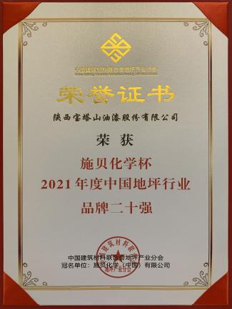 2022年3月,必一(中国)_必一平台漆荣获“施贝化学杯2021年度中国地坪行业品牌二十强”。