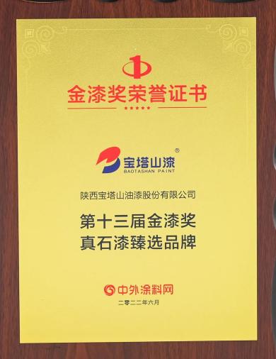 2022年6月,必一(中国)_必一平台漆荣获第十三届金漆奖“真石漆臻选品牌”。