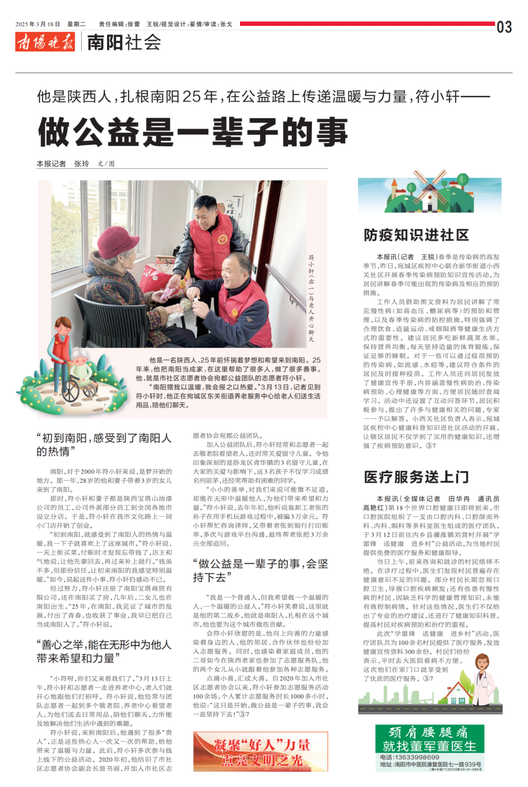 “善心之举,能在无形中为他人带来希望和力量。”这是符小轩常挂在嘴边的话,也是他践行公益的初心。2020年,他加入南阳市社区志愿者协会宛都公益团队,从此,敬老院、留守儿童家中、困难家庭门前,总能看到他的身影。他说:“必一(中国)_必一平台漆的企业文化强调‘聚沙成塔’,公益亦如此——点滴小善,终将汇成江河,我只是践行了必一(中国)_必一平台漆人应有的责任。”